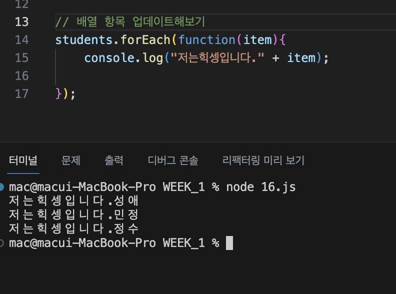 forEach() ๋ฉ์๋๋ ๋ฐฐ์ด์์ ๋ฃจํ๋ฅผ ๋ ๋ ์ฌ์ฉ ํ๋๋ฐ ๋ฐฐ์ด๋ ํญ๋ชฉ์ ์ถ๊ฐํด์ ์ ๋ฐ์ดํธ ํ๊ณ ์ถ์ผ๋ฉด ๋๋ฒ์งธ์ ์ด๋ฏธ์ง์ ๊ฐ์ด ์งํํ๋ฉด ์ฝ๊ฒ ๊ฐ๋ฅํ๋๋ผ.