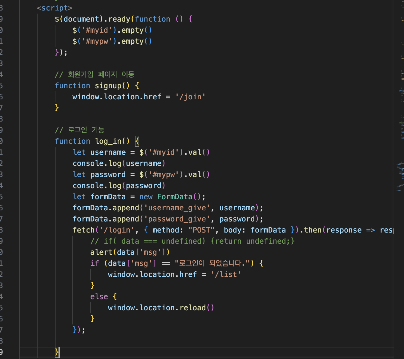 signup()μ΄λΌλ ν¨μλ₯Ό μ μνλ€. μ΄ ν¨μλ window.location.hrefλ₯Ό '/join’μΌλ‘ μ€μ νμ¬ νμκ°μ
